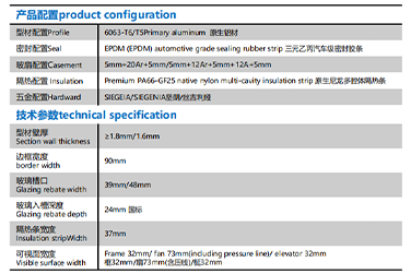 يعتمد ملفات الألومنيوم المكسورة الجسر من سلسلة 90 مع هيكل تجويف متعدد وشرائط عزل حراري نايلون PA66 مزدوجة ، والتي تتميز بعزل حراري ممتاز وأداء عزل صوتي. تصميم نافذة السفينة يضمن التهوية الكافية والختم الضيق ، مناسب للمباني الراقية مع متطلبات الأداء العالية للغاية.